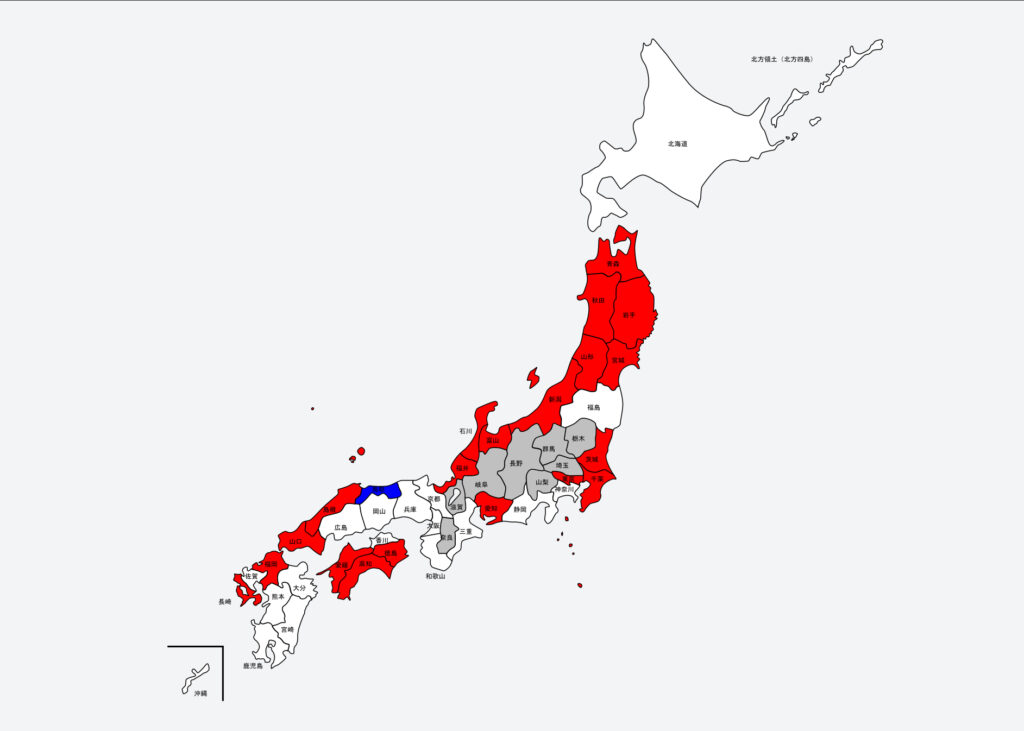 ・灰色が海なし県(優先順位が低い県)釣ることが出来るかも不明。